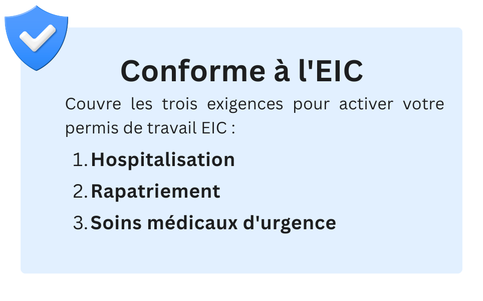 Pour assurer une arrivée sans heurts au Canada, les participants à l'EIC doivent satisfaire aux exigences d'assurance obligatoires du gouvernement. Dans le cadre du programme Expérience internationale Canada (EIC), une assurance complète est requise avant votre entrée au pays. Présenter une police valide à la frontière est la meilleure façon de s'assurer que votre permis de travail est délivré pour toute sa durée sans aucune complication.