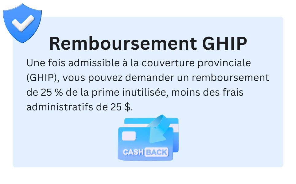 Alors que la plupart des polices ne vous remboursent que si vous quittez le Canada, nous vous remboursons une partie de votre prime pendant que vous y restez. Vous pouvez recevoir un remboursement de 25 % de votre prime restante (moins des frais de 25 $) une fois que votre couverture provinciale entre en vigueur.