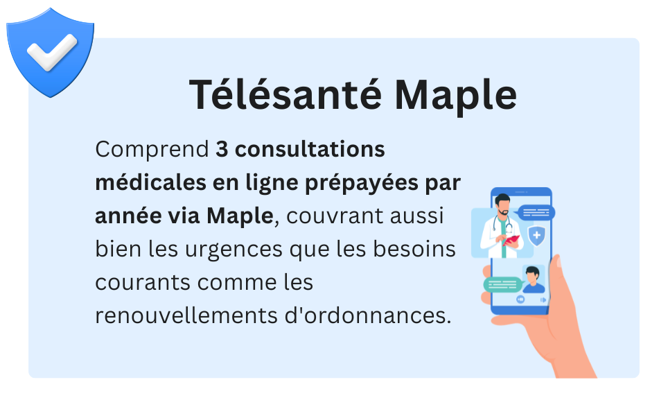 - Évitez la salle d'attente : Comprend 3 visites médicales virtuelles prépayées gratuites par année. Inscrivez-vous à getmaple.ca/bestquote pour commencer.